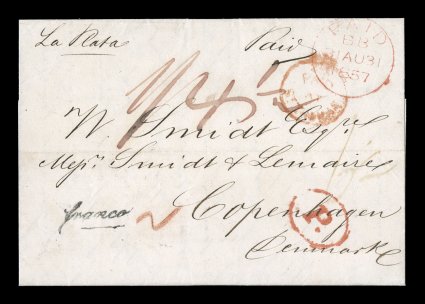 1330 c imagePaid / at / St. Thomas Crowned circle double-ring h.s. in red, clearly legible strike, on 1857 (Aug. 14) entire letter to Copenhagen via London, with transit d.s. of German and Danish Post Offices at Hamburg and unframed "franco", also shows oval "P." h.s. in red, rated "1 / 4 1/2" and endorsed "La Plata", a fresh and very fine cover. (Image) Est. $150-200