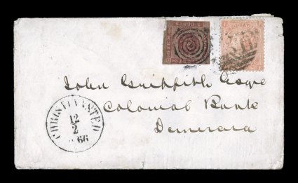 1331 c 1 image#1, 1856 3c Dark carmine (brown gum), large to full margins on three sides, just touched at top, on neat 1866 (Feb. 12) Colonial Bank envelope (minor faults as to be expected), from St. Croix to Demerara, British Guiana, cancelled by mute type target, showing "Christiansted" origin c.d.s. adjacent, and in combination with Great Britain 1865 4p pale vermilion plate 7 (#43a), trivial corner creasing, cancelled "C51", showing matching St. Thomas British P.O. d.s. as well as arrival c.d.s. on reverse, an exceedingly rare combination cover, of which less than ten DWI-British frankings are recorded. (Image) Est. $2,000-3,000
