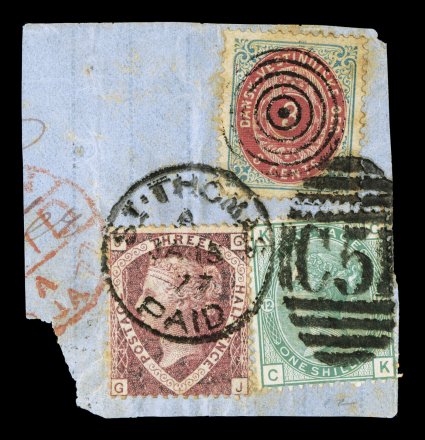 1332 O 6 image#6, 3c Blue and Carmine, tied to piece by target cancel in combination with Great Britain 1 1/2p Rose and 1/- Green (#32, 64), all three are tied by "St. Thomas/Paid/Ja 15 77" c.d.s. and "C5" oval, the D.W.I stamp has some gum toning, otherwise very fine; exceedingly rare, as less than ten mixed franking covers have been recorded. (Image) Est. $300-400