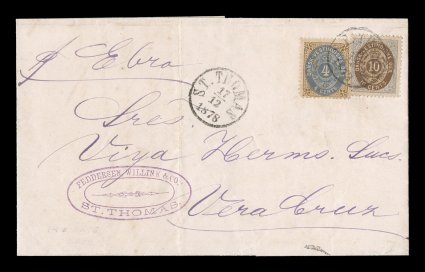 1333 c 7,10 image#7, 10, 1874-76 4c Brown and dull blue and 10c blue and brown on 1878 (Dec. 17) entire from St. Thomas to Vera Cruz, tied by St. Thomas c.d.s., quite fresh and clean, a very fine 14 cents rate usage via British packet. (Image) Est. $750-1,000
