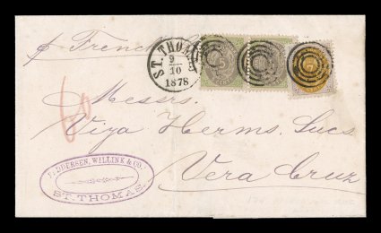 1334 c 8,9 image#8, 9, 1874-76 5c Green and gray (horizontal pair) and 7c lilac and orange on 1878 (Oct. 9) entire to Vera Cruz, cancelled by mute type target and additionally tied by "St. Thomas" c.d.s., the 5c has a few short perfs. and the 7c has blunt lower right corner, nevertheless a scarce and attractive 17 cents rate cover via French packet, which was in effect for less than twelve months. (Image) Est. $750-1,000