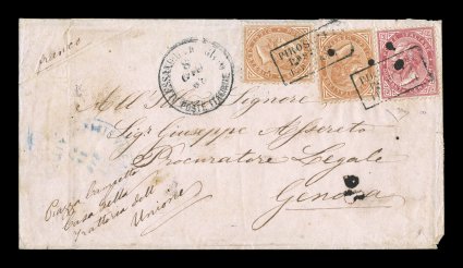 1335 c 27, 31 imageItaly #27, 31, 1863 10c Buff singles (2) and 40c Carmine, cancelled by framed "Piroscafi Postali Italiani" h.s. on 1865 (May 31) envelope to Genoa showing "Poste Vicereali Egiziane / Cairo" origin c.d.s. in blue indicating prepayment (prior to the issue of Egyptian stamps) to Alexandria and "Alessandria d'Egitto / Poste Italiane" c.d.s. from whence the Italian stamps were applied, some cover faults including flap at back missing, a rare and early "combination" cover; 1992 Enzo Diena certificate. (Image) Est. $1,000-1,500