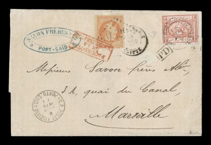 1336 c image#13, 1867 Penasson 1pi Rose red, cancelled by "V.R. Poste Egiziane / Porto Said" c.d.s. and framed "P.D." on 1870 (Apr. 8) entire to Marseille, in combination with France 1863-70 Laureated 40c Pale orange (#35) to pay external postage, tied by "5080", "Alexandrie / Egypte" c.d.s., and framed "Paquebots / de la / Mediterranee" h.s. in red; entire split across fold at top, nevertheless a very fine and appealing combination cover through the French Post Office; signed Calves and E(nzo) D(iena). (Image) Est. $400-500