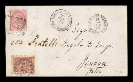 1337 c 22 image#22, 1872 Bulaq printing 1pi Rose red, on 1872 (June 23) envelope to Genoa cancelled by "V.R. Poste Egiziane / Cairo" c.d.s. in combination with Italy 1863 40c carmine (#31) to pay overseas postage cancelled "234" and showing "Alessandria d'Egitto / Poste Italiane" c.d.s. adjacent, backstamped on arrival, stamps have light peripheral foxing and the Italian adhesive with small tears at top, rare combination cover; 1956 Alberto Diena certificate. (Image) Est. $500-750