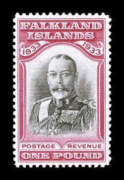 1338 og 76 image#76, 1933 £1 Centenary, lovely mint single possessing exceptional centering, sumptuously rich colors and crisp impressions on fresh white paper,full clean o.g. that is extraordinarily lightly hinged, extremely fine; a handsome example of this popular high value; ex-Bleuler. (S.G. #138; £1,700). (Image) $1,850.00