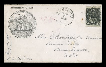 1339 c image1887 Missionary letter datelined "On the "The Morning Star"/October 24, 1887/Butartitari/Gilbert Islands/Micronesia South Seas" written by a Missionary there to her little niece, Elisabeth in Newton Center, Mass., not posted until this whaling ship, "The Morning Star" reached Hawaii six months later using an illustrated envelope that the Captain had given to Aunt Saddie, specifically for the girl and mentioned in the letter, Hawaii 10c Black (#40) tied by target cancel with "Honolulu/H.I./Apr 21 1888" c.d.s., San Francisco transit, backstamped, very fine; accompanied by contemporaneous photo card of Missionary in the Gilbert Islands, a pressed flower mentioned in the letter and a post card showing "The Morning Star"; a fascinating cover and letter out of the Gilbert Islands five years before the Islands were annexed to Great Britain; ex-Bleuler. (Image) Est. $400-500