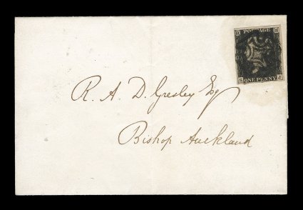 1340 c 1 image#1, 1840 1p Black, plate 10, position S-J, attractive single with four well clear to large margins, tied to petite entire 1841 letter by black Maltese cross, with single-arc "Durham/MA 25 1841" c.d.s. on the reverse to Bishop Auckland, very fine and a scarce plate used on cover; ex-Bleuler (S.G. Specialized #AS66g; £1,600). (Image) Est. $750-1,000