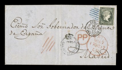 1361 c S.G. #CC1 imageS.G. #CC1, Black "Paid at/San Juan Porto Rico" Crowned Circle, an unusually clear and attractive strike of this scarce marking on folded 1857 entire letter to Madrid, Spain, in combination franking with choice Cuba 1/2r Greenish black with four extra-large margins (Scott #9 var), most interestingly this cover either did not go through the Puerto Rican post office or if it did they forgot to apply that post office's markings, as the stamp is tied by French transit c.d.s. and a Spanish blue oval grid which was quite likely applied on arrival in Madrid, lovely British "San Juan Porto-Rico/SP 21/1857" double-arc c.d.s. on the reverse, via London with "Paid" c.d.s. and "PP" in circle, then via France to Spain where backstamped, ms. "1/11" British rate, extremely fine; not only is this an unusual and rare usage, but the condition is outstanding with all markings, both front and back, well struck and attractive, magnificent condition rarely found on these covers; Francisco Graus certificate; ex-Jarrett. (Image) Est. $2,000-3,000
