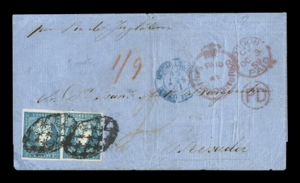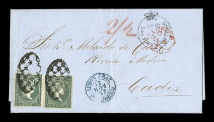 1363 c imageCuba 1855 1/2r Blue green horizontal pair (#1), with large margins all round and tied by bold elliptical h.s. on 1859 (Sept. 13) entire to Spain (Oct.10) via London (Oct. 3), showing "Admon. Gral. / Puerto Rico" origin c.d.s. in blue and very fine "Paid / at / San Juan Porto Rico" Crowned circle h.s. in red adjacent, with "San Juan Porto Rico" double arc d.s. on reverse, rated "1 / 9", an outstanding cover perfect for exhibition. (Image) Est. $750-1,000