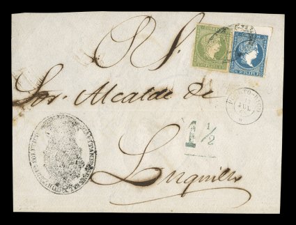 1364 O Cuba #10, 12 imageCuba #10, 12, 1856 1r Gray green and 1857 1/2r Blue, mostly large margins including portion of top sheet margin on the 1/2r (trace of edge toning to stamps), tied by black oval grid of San Juan on official cover front with large oval official cachet, to Luquillo, "Puerto Rico/13 Jul 61" cds and bold "1 1/2" rate handstamp, very fine; official usages are almost invariably only fronts and are collected as such; a rare and desirable usage; ex-Jarrett. (Image) Est. $400-500