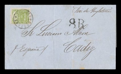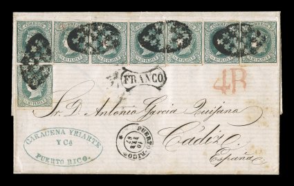 1365 c Cuba #18 imageCuba #18, 1864 1/2r Green, an impressive franking of eight singles on entire folded letter to Cadiz, Spain, seven with clear to large margins that is configured like a horizontal strip of seven, eighth is just into the frame at bottom right and slightly affected by light horizontal file fold in cover, all tied together and additionally tied to the cover by attractive black "Franco" framed handstamp, strong "Puerto Rico/10 Feb 67" c.d.s. of the post office at San Juan, red "4R" rate hs., red London transit on the reverse and backstamped, extremely fine; a lovely and rare franking with great eye appeal; ex-Lea Leonard, Jarrett. (Image) Est. $2,000-3,000