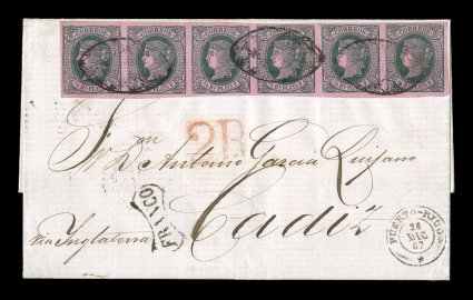 1366 c Cuba #19 imageCuba #19, 1864 1/2r Green on pale rose an absolutely phenomenal horizontal strip of six, possessing large even margins all around, plus intense deep colors, on attractive and exceptionally clean entire folded letter to Cadiz, Spain, three centrally struck light oval cancels of the post office at San Juan with nice "Puerto-Rico/ 26 Dic 67" double circle c.d.s. at bottom right, matching black framed "Franco" and red "2R" handstamps, on the reverse is a red London transit and Cadiz backstamp, extremely fine showpiece; the spectacular condition of this cover can not be over emphasized, certainly ranking among the prettiest covers in philately; 1986 PF certificate; ex-Jarrett. (Image) Est. $2,000-3,000