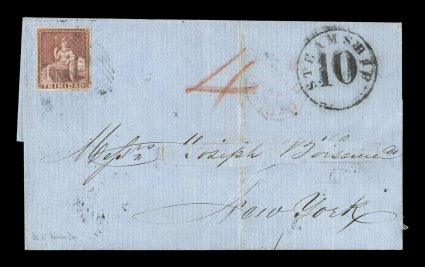 1367 c 6 image#6, 1857 1p Rose red on white paper, bright shade with large even margins, on 1858 (Dec. 25) entire (addressee's name cut out and replaced) to New York via St. Thomas (Dec. 30), cancelled by light barred oval "1" obliterator leaving most of "Britannia" design clear, showing "Paid / at / Trinidad" Crowned circle h.s. in red and circular "Steamship/10" h.s. adjacent, with origin and transit c.d.s. on reverse, rated "4" for the interisland rate and the Steamship 10 corresponds to the rate from St. Thomas to New York, very fine; 1994 Holcombe certificate (S.G. #12). (Image) Est. $750-1,000