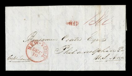 1395 c imageLiberia interesting early correspondence of fourteen pre-stamp transatlantic covers of 1840-48 during the Commonwealth of Liberia just prior to becoming a Republic (one 1848 letter from the first year of the Republic) plus a fifteenth very interesting 1845 letter form Reverend H. Teage without cover sheet but letter speaks at length of conditions in the colony, twelve of these letters are to Benjamin Coates, of the Colonization Office in Philadelphia, who was involved in the abolitionist movement and the colonization of Liberia by America slaves, ten of these are from Monrovia including an 1840 letter from Thomas Buchanan, brother of President Buchanan and Governor of Liberia from 1839-1841(he died at Bassa Cove on September 3, 1841 in the care of the Sheridans), the other two covers to Coates are from Louis Sheridan at Bassa Cove, also two missionary letters, one from Monrovia and the other from Settra Kroo, the fourteen covers have various ship markings and rates as they were posted on any ship available coming to the United States, the U.S. connection with the colonization of Liberia makes this early African correspondence a bit more available, but any pre-1850 cover from the west coast of Africa is very scarce; ex-Bleuler. (Image) Est. $1,500-2,000