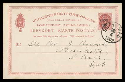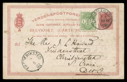 1421 c imageWorldwide Missionary correspondence consisting of over 100 postal cards and postal envelopes, plus a few pieces of mint postal stationery, this largely centers around Moravian Missionaries in the West Indies, largely a Rev. Howard who was in various locations in the Danish West Indies (mostly West End on St. Croix) and Basseterre, St. Kitts, nearly all of these are turn-of-the-century period and within the West Indies, but some from the United States and Europe to the Caribbean, we note a fair amount of postal stationery of D.W.I. including several "1/Cent/1902" surcharges on 3c Red postal cards (Scott #UX8; $150.00 each) and a 4c Bisect cover from St. Thomas to West End, St. Croix, also a fair number of Leeward Islands stationery used from St. Kitts plus stationery from other West Indies countries, condition is rather mixed with some damaged, but fine-very fine are present as well; examine. (imagea) (Image) Est. $1,000-1,500