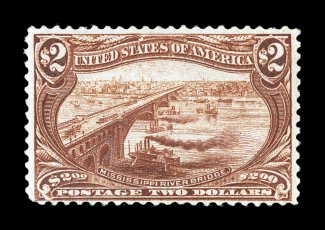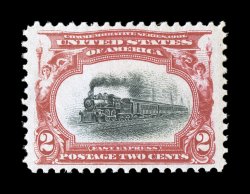 clean impression, o.g., lightly hinged, choice very fine a most attr#293, $2.00 Trans-Mississippi, exceedingly well centered within very wide margins which are rarely associated within this difficult commemorative stamp, lovely rich color and a clean impression, o.g., lightly hinged, choice very fine; a most attractive Two Dollar Trans-Mississippi; 2000 PF certificate. (Image) $2,250.00