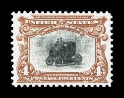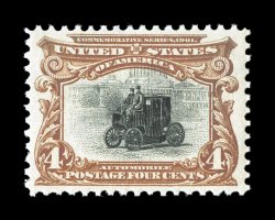 impressions on fresh crisp paper, o.g., n.h., extremely fine a tru#296, 4c Pan-American, an incredibly handsome mint single, near perfect centering amid much larger margins than usually found on this value, deep luxuriant colors and razor-sharp impressions on fresh crisp paper, o.g., n.h., extremely fine; a true gem Four Cent Pan-American; 1992 PF certificate and a 2006 PSE certificate (XF-Superb 95; SMQ $1,550.00). (Image) $200.00