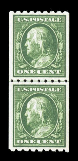 extremely fine 2007 PSE certificate (XF-Superb 95 SMQ $360.00).#390, 1c Green coil, perf. 8 1/2 horiz., select quality guide line pair, extraordinarily well centered within large margins, deep rich color and a sharp impression, o.g., n.h., extremely fine; 2007 PSE certificate (XF-Superb 95; SMQ $360.00). (Image) $80.00