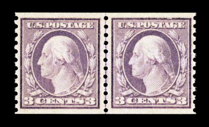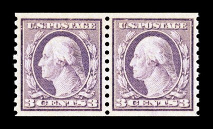 $285.00).#493, 3c Violet coil, Ty. I, perf. 10 vert., mint pair, excellent centering within large margins, rich color, o.g., n.h., extremely fine; 2007 PSE certificate (XF-Superb 95; SMQ $285.00). (Image) $75.00