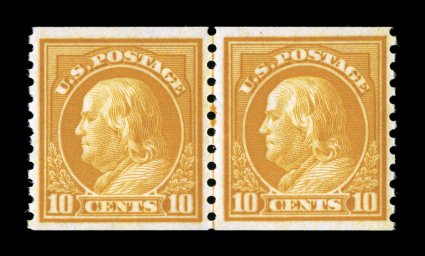 certificate.#497, 10c Orange yellow coil, perf. 10 vert., joint line pair, exceedingly well centered, uncommonly deep intense color and impression, o.g., n.h., extremely fine; 1997 PF certificate. (Image) $280.00