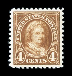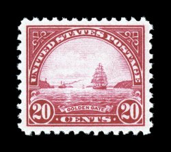 impressive is the stamps spectacular prooflike color and impression on the#567, 20c Carmine rose, a stunning mint single in the finest attainable quality, possessing mathematically precise centering amid exceptionally large margins, but just as impressive is the stamp's spectacular prooflike color and impression on the brightest paper possible, pristine o.g., n.h., superb; an incomparable stamp for the most fastidious collector; 2007 PSE certificate (Gem 100; SMQ $1,200.00 for 98, the highest grade that they price); this gem is the only #567 to receive the prestigious Gem 100 grade from the PSE, the highest grade they have assigned this stamp. (Image) $42.50