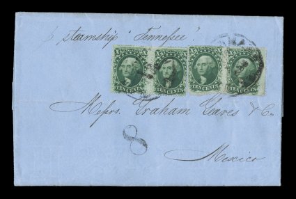 right stamps with faint scoring line at top, otherwise very#35, 10c Green, Ty. V, horizontal pair and two singles, tied by New Orleans c.d.s. on 1859 folded letter to Mexico, endorsed "pr. Steamship Tennessee", "8" reales due marking, three right stamps with faint scoring line at top, otherwise very fine. (Image) Est. $400-500
