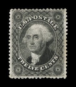 lightly hinged, extremely fine a notoriously difficult stamp to find not#36, 12c Black, plate I, incredibly well centered for this issue, strikingly intense color and a prooflike impression on brilliantly fresh and crisp paper, full clean o.g., lightly hinged, extremely fine; a notoriously difficult stamp to find not only this well centered, but this choice as well; 1993 PF certificate; ex-Lessin. (Image) $2,000.00
