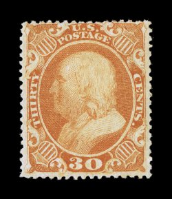 hint of oxidizing so often encountered on orange colored stamps, stron#38, 30c Orange, an outstanding mint example that is not only extraordinarily well centered, but brilliantly fresh as well, gorgeous intense color in a deep shade, without any hint of oxidizing so often encountered on orange colored stamps, strong detailed impression on bright paper, full o.g., minor h.r., extremely fine; few original gum examples are as fresh and choice as this particular copy; ex-Chapin. (Image) $2,500.00