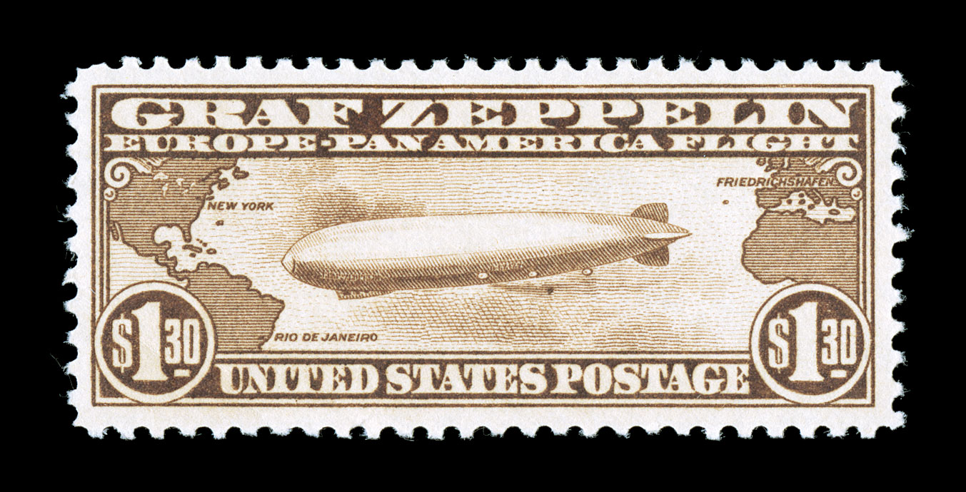 from Lakehurst to Friedrichshafen, German and U.S. flight cachet#C13, 65c Graf Zeppelin, tied to flown first day card by "Washington, D.C./Apr 19/1930" machine cancel, stamp is fresh and attractive, held over to be flown on the return flight from Lakehurst to Friedrichshafen, German and U.S. flight cachets, Friedrichshafen receiving c.d.s. on front and New York Zeppelin backstamp on return to the United States, very fine and scarce as few single frankings were made on flown items. (Image) $1,200.00