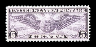 o.g., n.h., extremely fine 2007 PSE certificate (Superb 98 SMQ $690.0#C16, 5c Winged Globe, gem mint example that is precisely centered within much larger margins than usually found on this difficult stamp, intensely rich color and impression, o.g., n.h., extremely fine; 2007 PSE certificate (Superb 98; SMQ $690.00); only one stamp grades slightly higher (98J). (Image) $8.75
