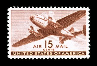 of only two stamps to receive the coveted Gem 100 grade from the#C28, 15c Brown carmine, mathematically precise centering within large margins, rich vibrant color, immaculate o.g., n.h., superb; 2007 PSE certificate (Gem 100; SMQ $560.00); one of only two stamps to receive the coveted Gem 100 grade from the PSE. (Image) $2.25