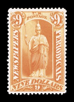 most impressive is the reverse, sporting flawless o.g. that is nev#PR75, $12.00 Yellow green, a remarkable quality mint single that is extraordinarily well centered within lavishly large margins, intense prooflike color and impression, perhaps most impressive is the reverse, sporting flawless o.g. that is never hinged, extremely fine gem; the finest never hinged example of this newspaper stamp we have ever offered; 1985 PF certificate and a 2007 PF certificate (XF 90; SMQ does not price never hinged). (Image) for hinged $875.00