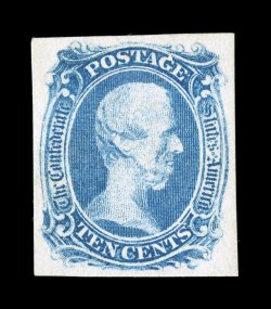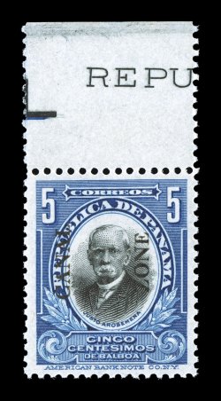 impressions on fresh paper, pristine o.g., n.h., extremely fine cer#48, 5c Deep blue and black, a striking top margin partial imprint single, extraordinarily well centered within lavishly large margins, sumptuously rich colors and deeply etched impressions on fresh paper, pristine o.g., n.h., extremely fine; certainly among the finest quality examples of this stamp available, as it is almost never encountered in this gem never hinged condition; 1999 PF certificate. (Image) for hinged $500.00