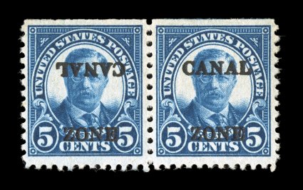 is l.h.), very fine only 32 examples are recorded, and probably onl#86b, 5c Blue, "CANAL" inverted, horizontal pair, positions 7-8LR, position 7 being the error, well centered, deep color, fresh o.g., the error stamp is never hinged (position 8 is l.h.), very fine; only 32 examples are recorded, and probably only a couple of those exist never hinged; 2007 PF certificate. (Image) for hinged $950.00+