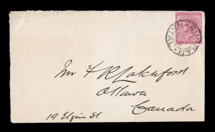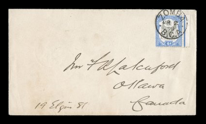Postmaster or Commandant nearest Parmhele, fresh single with typica1898 2c Black, blue and carmine Imperial Penny Postage, Christmas first day cover of the Imperial Penny Postage, a Latchford cover to British Central Africa, addressed to the Postmaster or Commandant nearest Parmhele, fresh single with typical just fine centering of his covers, tied by "Ottawa/Dec 25 1898" machine cancel, London and Aden transits, with Chinda, B.C.A. transit and backstamped Zomba, note from the British Central African Postmaster's General office in red on the reverse reads "As Parmhele is unknown this communication was opened and dealt with at the PMG's office Zomba", slight postal wear to the cover, very fine; this is one of the countries that complied with Mr. Lachford's request that both this envelope be returned to him and also the enclosed self-addressed envelope is included with 1p Ultramarine and black right sheet-margin single (Scott #43) tied by "Zomba/B.C.A./MR 2 99", Chinde transit and backstamped Ottawa, a very fine petite B.C.A. cover with the Imperial Penny Post rate; matched pairs of covers, such as this, are of great rarity with only eleven pairs recorded furthermore this is the only example known posted on the Christmas first day to British Central Africa; ex-Latchford (Unitrade #86). (imagea) (Image) Est. $3,000-4,000