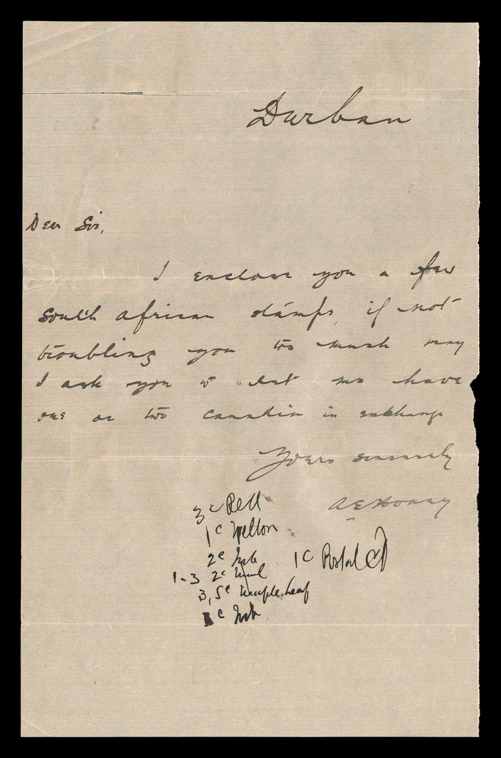 1898 machine cancel, London transit, backstamped Durban, stamp wit1898 2c Black, blue and carmine Imperial Penny Postage, Christmas first day cover of the Imperial Penny Postage, a Latchford cover to Natal with single tied by "Ottawa/Dec 25 1898" machine cancel, London transit, backstamped Durban, stamp with just fine centering, cover has small edge tear at top and with vertical folds, none of which affects the stamp, otherwise very fine; the folds are probably the result of the cover having been folded to go into the envelope that Latchford enclosed for a Natal posting back to him; that Natal cover is also included with a 1p Rose (Scott #67; slightly nibbed perfs. at top) tied by "Durban/Natal/30 JA 99" double-circle c.d.s., enclosure of the postmaster (fold splits) also included wanting to exchange Natal stamps for Canadian stamps, minor edge crease at top left of cover, very fine; another very rare matched set of covers of which only eleven pairs are recorded; this is also the only known cover posted on the Christmas first day of the Imperial Penny Postage to Natal; ex-:Latchford (Unitrade #86). (imagea) (imageb) (Image) Est. $3,000-4,000