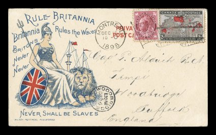 to both stamps) tied to multicolor Britannia Rules the Waves po1898 2c Black, lavender and carmine Imperial Penny Postage, single showing uniform brown "muddy water" effect along with 3c Carmine "Maple Leaf" (Unitrade #69; light perf. staining to both stamps) tied to multicolor "Britannia Rules the Waves" post card to England by "Montreal/Dec 15, 1899" flag machine cancel, backstamped Woodbridge on front and back, slight corner bends to the card, otherwise very fine; all the excitement over the new penny rate not coming until Christmas perhaps caused the sender not to realize that post cards could already be posted by the U.P.U. rate for 2c and that the 3c stamp was not necessary, a rare and early usage (Unitrade #85). (Image) Est. $300-400