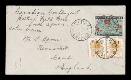 V.R.I.12p on 12p Orange horizontal pair of Orange River Colony (Scott 41898 2c Black, deep blue and carmine Imperial Penny Postage, a fresh and well centered single with bright rich colors, tied to neat military cover to England along with "V.R.I./1/2p" on 1/2p Orange horizontal pair of Orange River Colony (Scott #44j), both tied by "Army P.O. 43/S. Africa/JY 24 00" c.d.s. pmks., "Canadian Contingent/British Field Force/South Africa" inscribed at top left, backstamped Newmarket, an extremely fine and handsome cover; Canadian postage was not really valid in South Africa, even under these war conditions; it has been speculated that the Canadian stamp was applied for patriotic reasons by a proud Canadian soldier, or that it may even have even been accepted as payment by a tolerant army post office official who then applied the proper stamps; nevertheless a marvelous usage of the Two Cent Imperial Postage stamp and a wonderful rarity, this being one of only two such covers known posted from South Africa, both posted by the same soldier with the other bearing a "Field P.O./British Army South Africa" postmark (Unitrade #86b). (Image) Est. $1,500-2,000