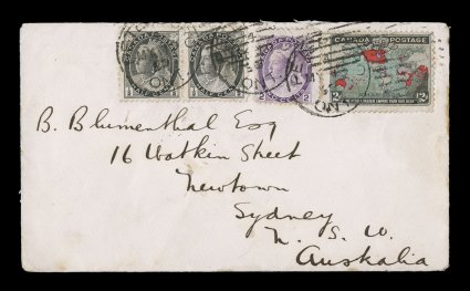 Sydney, N.S.W., Australia by PeterboroOnt.MY 19 99 duplex1898 2c Black, blue and carmine Imperial Penny Postage, single, along with 1/2c Black horizontal pair and 2c Purple single "Numerals" (Scott #74, 76), tied to neat cover to Newton, Sydney, N.S.W., Australia by "Peterboro/Ont./MY 19 99" duplexes, imprint on the back flap of the Sheriff's Office of Peterboro, Ottawa and Vancouver transits plus Newton and Sydney backstamps, very fine and handsome cover; Australia, which was in their Confederacy of States period prior to becoming a unified nation, did not join the Imperial Penny Postage scheme until 1905, thus the U.P.U. rate of 5c applied during the period of the 1898 Map stamp; this lovely and extremely rare cover is the finer of only two covers recorded to Australia (Unitrade #86). (Image) Est. $500-750