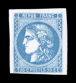 hinged, very fine and scarce signed A. Brun and accompanied by a 2004 P. L#45, 1870 20c Blue on bluish, Ty. III, report 2, pristine mint example, clear to large margins on all four sides,fresh strong blue color on bright paper, full o.g., never hinged, very fine and scarce; signed A. Brun and accompanied by a 2004 P. Loeuillet certificate (Yvert #46B; for hinged €1,200). (Image) for hinged $725.00