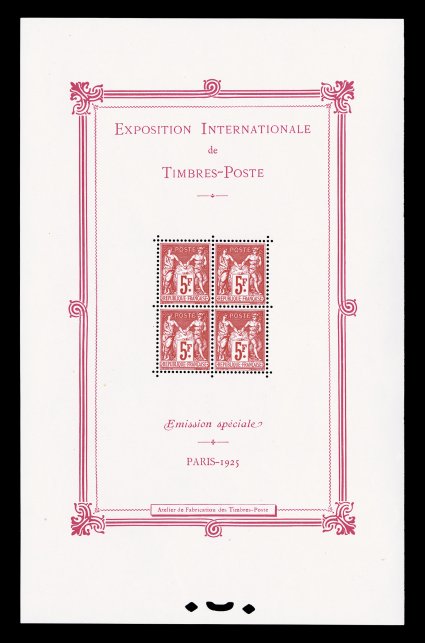 fine and choice (Yvert Bloc 2 Ç2,500).#241, 1927 Strasbourg Exhibition souvenir sheet, remarkably fresh mint sheet, crisp and well centered, stamps have lovely bright colors on white paper, flawless o.g., n.h., very fine and choice (Yvert Bloc #2; €2,500). (Image) $1,600.00