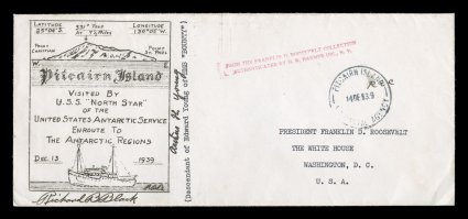 President Franklin D. Roosevelt, signed by Richard B. Black designe1939 U.S.S. "North Star " Expedition to the South Pole cover, special cacheted cover posted on Admiral Byrd's visit to Pitcairn Island on his way to the South Pole, posted to President Franklin D. Roosevelt, signed by Richard B. Black designer of the cachet and Arthur H. Young, descendent of Edward Young of the H.M.S. "Bounty", "Pitcairn Island/N.Z. Postal Agency/ 14 DE 39" c.d.s. and initialed by Postmaster Richard Edward Christian indicating that postage had been paid even though no stamps were available, very fine; about 200 covers were prepared thus for delivery to the United States and accompanied by the mimeographed letter enclosed that describes the cover and occasion; a particularly desirable example having been sent to President Roosevelt; red Roosevelt collection handstamp on front and back. (Image) Est. $1,000-1,500