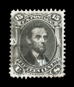 plus its color is especially deep and its impression razor sharp, lig#98, 15c Black, "F" grill, on very thin paper, an extraordinarily choice used example that features uncharacteristically large and marvelously well balanced margins all around, plus its color is especially deep and its impression razor sharp, light cork cancel as well as portions of red and blue foreign transit pmks., an extremely fine gem; 2005 PSE certificate (XF-Superb 95; SMQ $1,800.00); this is the highest grade the PSE has given this stamp, being one of only three (all used) to grade XF-S 95. (Image) $300.00