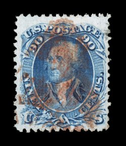 sharp impression on fresh white paper, cancelled by a red cork can#101, 90c Blue, "F" grill, an especially attractive used example of this scarce high value, exceptionally well centered within unusually large margins, lovely rich color and a sharp impression on fresh white paper, cancelled by a red cork cancel, extremely fine; 2006 PF certificate. (Image) $2,100.00