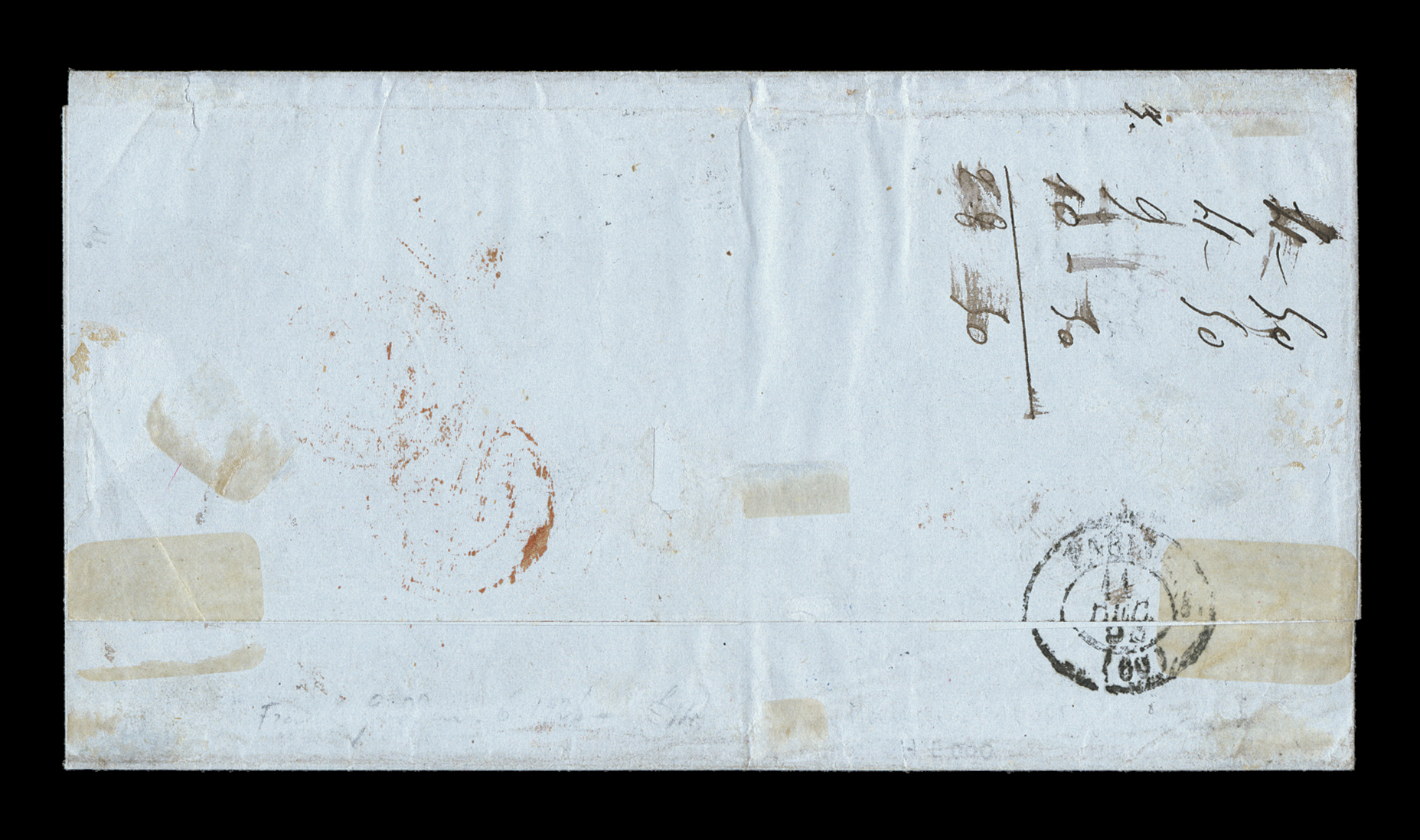 light strike of a Basse Terre transit c.d.s. on entire folded le1853 Grand Bourg unpaid stampless entire letter to France, light but discernible strike of black "Grand-Bourg (Mie. Gte.)/Guadeloupe/25 Juil 1853" double-circle c.d.s. and similarly light strike of a Basse Terre transit c.d.s. on entire folded letter from the Mayor of Grand Bourg with attractive large double-circle cachet of the Mayor's office, via British packet with London crown transits on the reverse, red Calais entry transit and boxed Article 13 handstamp, bold "15" handstamp for 15 decimes due, backstamped, very fine single rate letter; very rare from the small town of Grand-Bourg on the small island of Marie Galante; rated scarcity 5 by Jamet with only a few examples known. (imagea) (Image) Est. $300-400