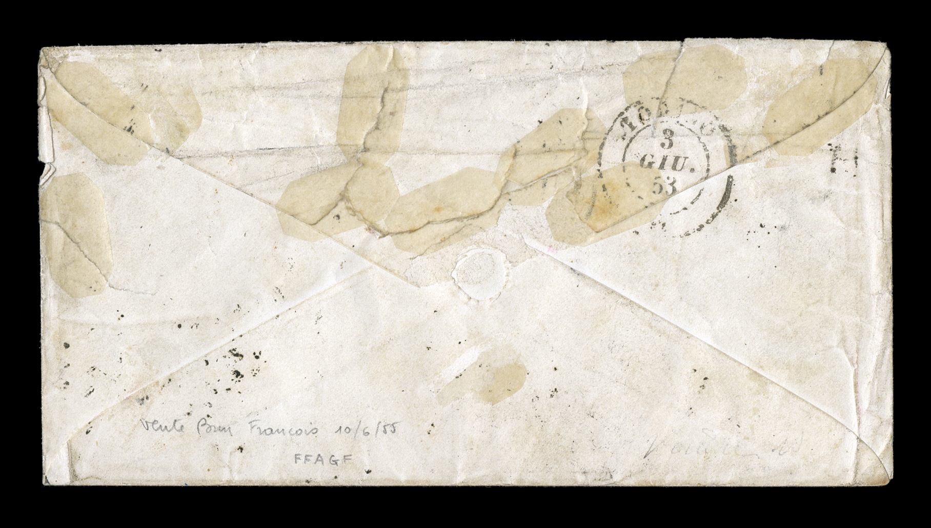 cancel of Paris, clear black Pointe-a-PitreGuadeloupe8 MaiFrance Yvert #1, #6, 1849 1Fr Carmine horizontal strip of three along with four singles of the 1850 10c Bister, all tied to 1853 cover to Turin, Sardinia by large point roller cancel of Paris, clear black "Pointe-a-Pitre/Guadeloupe/8 Mai 1853" double-circle c.d.s. at right, posted via British packet with red Calais entry transit and boxed "PD" handstamp, all markings being unusually clear, backstamped Turino, stamps with mostly clear to large margins, several stamps, including one stamp in the strip, with edge flaws from postal wear being affixed close to the edge, closed tears to the backflap, still impressive and of very fine appearance. The French stamps issued to Guadeloupe and the other colonies were really for the purpose of prepaying correspondence to France. There apparently was no reason why letters could not be prepaid to other countries in Europe. In fact, the issuance of the 10c implied that eventuality because the 25c and 1Fr values were all that were required to pay the rate and its multiples to France. This cover illustrates the most efficient franking of the double 1Fr70c rate to the Italian States. It could not have been correctly made if there were no 10c values. While foreign postings were apparently permitted and possible, the great rarity offered here is the only known example using French stamps to any other country than France from any of the four colonies that received these stamps; a wonderful and probably unique cover described thus on the accompanying certificate; signed R. Calves and accompanied by his 2001 certificate. (imagea) (Image) Est. $15,000-20,000
