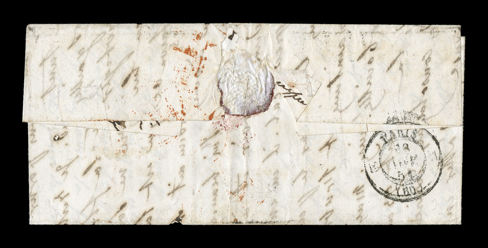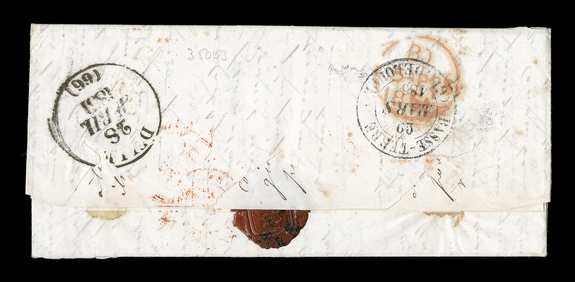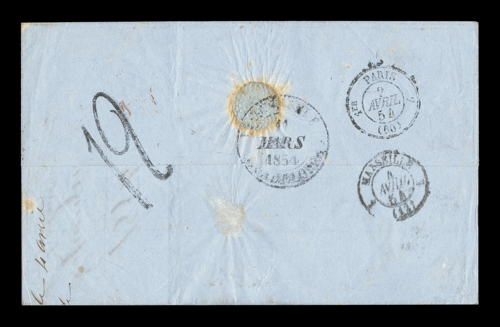 transit c.d.s. over the letter seal on the reverse, this single-rate c1854 Grand Bourg paid stampless cover to France, black "Grand-Bourg (Mie. Gte.)/Guadeloupe/9 Mars 1854" double-circle c.d.s. on folded cover to Marseilles, similar Basse Terre transit c.d.s. over the letter seal on the reverse, this single-rate cover was paid in cash with boxed "PD" handstamp on the front and the black "12" rate handstamp on the reverse, via British packet with red entry transit, backstamped, very fine; though stamps were no longer available this cover establishes that letters could be pre-paid by the sender in this period; this large format postmark of Grand Bourg on the small island of Marie Galante is quite rare; rated scarcity 5 in Jamet with only a few examples recorded. (imagea) (Image) Est. $300-400