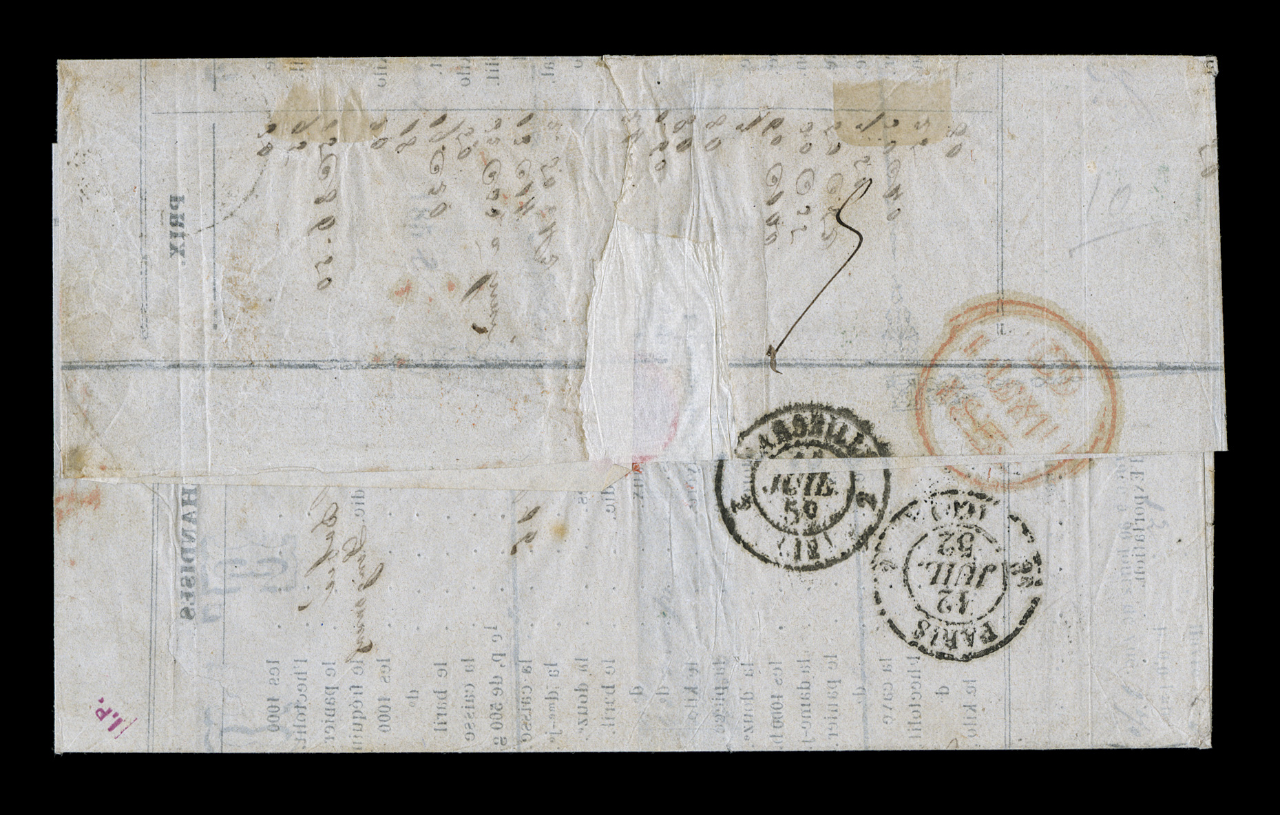 prices current, via British packet with London transit on the reve1852 Pointe-a-Pitre unpaid stampless cover to France, black "Pointe-a-Pitre/Guadeloupe/13 Juin 1852" double-circle c.d.s. and similar Basse Terre transit c.d.s. on folded cover of prices current, via British packet with London transit on the reverse, red Calais entry transit and boxed Article 13 handstamp, "30" handstamp for 30 decimes due, backstamped Marseilles, minor tears to backflap, very fine double rate letter. (imagea) (Image) Est. $150-200