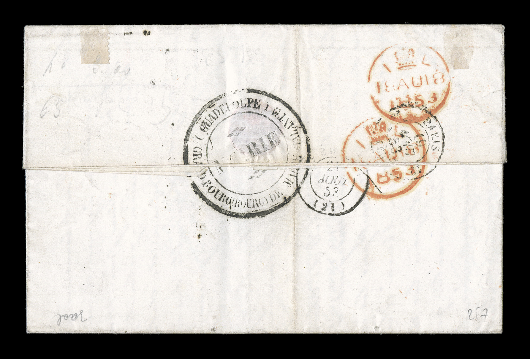14 c 1853 Port Louis unpaid stampless cover to France, extremely rare Port-LouisGuadeloupe27 Juin 1853 double-circle c.d.s. on attractive folded cover to France, ms. West India Steam