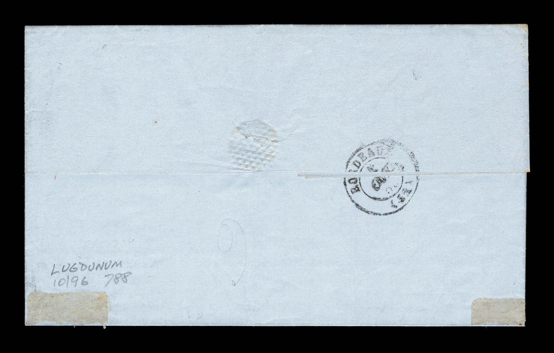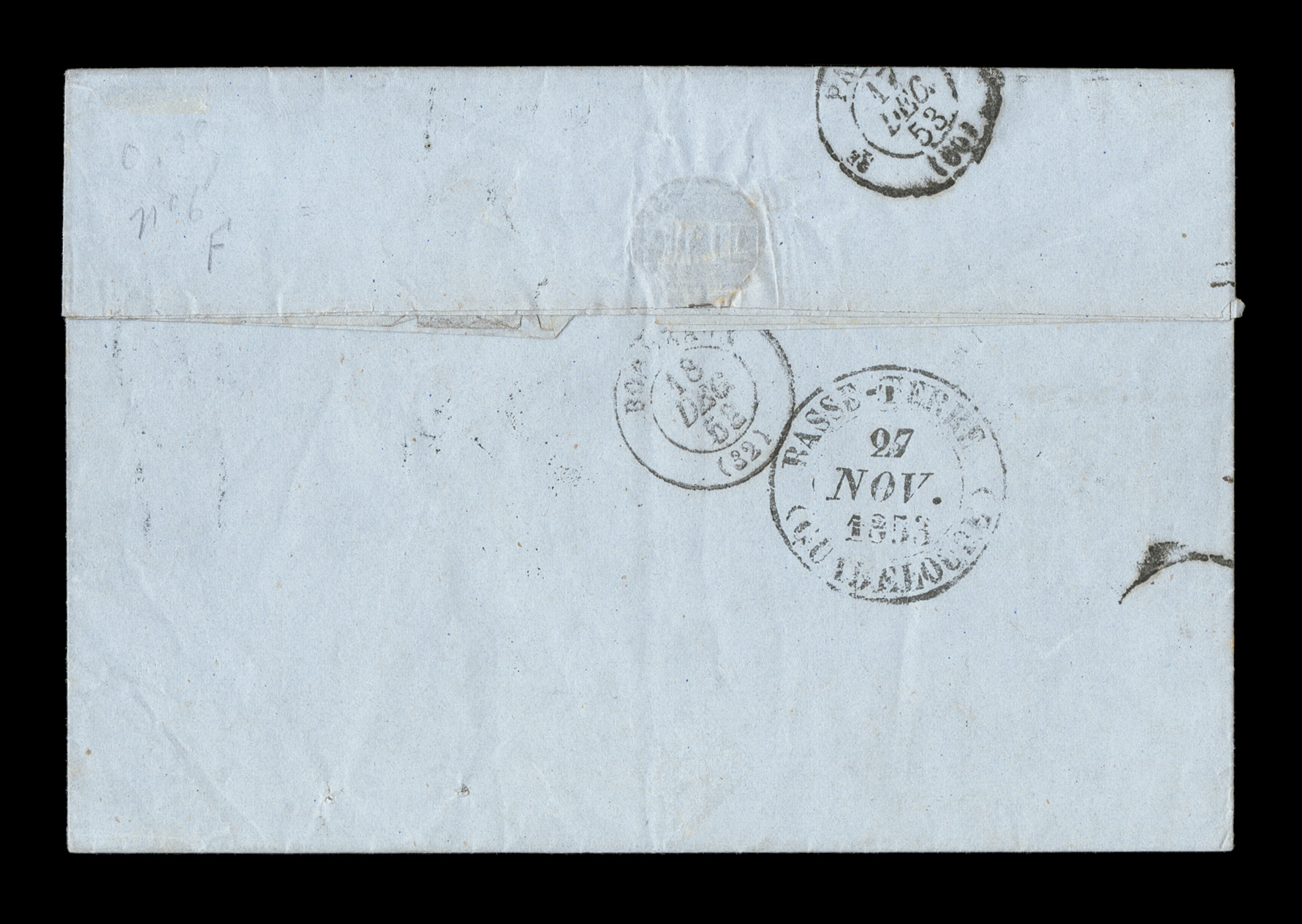 grill cancel, bold black Basse-TerreGuadeloupe2 Nov. 1851 doublFrance Yvert #4, 6, 1849 25c Blue horizontal pair and 1Fr Carmine, each with large balanced margins, tied on arrival to petite folded 1851 entire letter to Paris by French roller grill cancel, bold black "Basse-Terre/Guadeloupe/2 Nov. 1851" double-circle c.d.s. at right, red Calais entry transit and boxed "PD" handstamp, backstamped Paris on November 28, 1851, an exceptionally attractive cover paying the single rate to France via British packet, very fine.Beginning in late 1851 through 1853 France initiated the trial use of the current first issue Ceres stamps of France in the four colonies of Guadeloupe, Martinique, French Guiana and Reunion. Three values, the 10c, 25c and 1Fr Ceres first issue, were sent to these colonies to prepay the postage of 1Fr50c per 7.5 grams to France via England by British packet. Letters entered France from England via Calais. The stamps were applied in the colony, in this case Basse-Terre, Guadeloupe, but were not cancelled until they reached France.This small letter is a member of a tiny population of less than 50 covers recorded using French stamps from Guadeloupe. These stamps were only in use for approximately two years before their use was terminated and the experiment considered to be generally unsuccessful. The cover offered here is the earliest recorded use of French stamps, not just in Guadeloupe, but in all of the colonies in which they were placed in use. This cover is the premier cover of the French stamped covers of Guadeloupe and a great rarity that is indispensable for an award winning collection of this country; signed R. Calves and accompanied by a 1999 J. Robineau certificate; ex-Schatzkes. (imagea) (Image) Est. $20,000-25,000